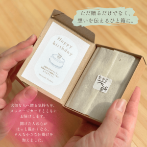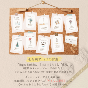 さらに、選べる9種類のメッセージカード付きで「ありがとう」「Happy Birthday」などぴったりな言葉を添えることができます。もちろんカードなしもOKで、自分へのご褒美としてもおすすめです♪