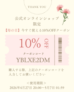 現在、公式オンラインショップにて「【母の日】今すぐ使える10%OFFクーポン」配布中です!